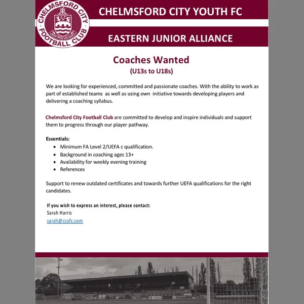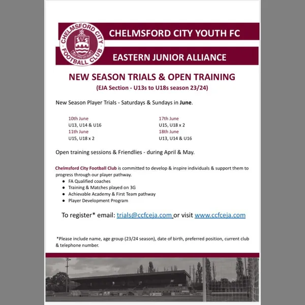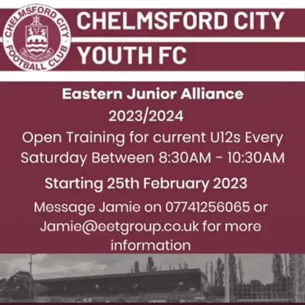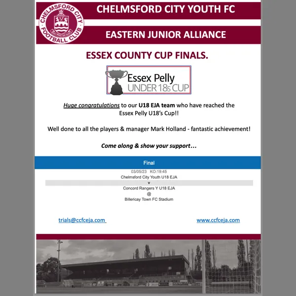 Our @ChelmsfordEJA18 will play in the Essex Pelly Cup Final next week, on Wednesday 3rd, at Billericay's New Lodge Stadium against Concord Rangers EJA U18. We wish Mark Holland, his staff and players the very best of luck in the final!